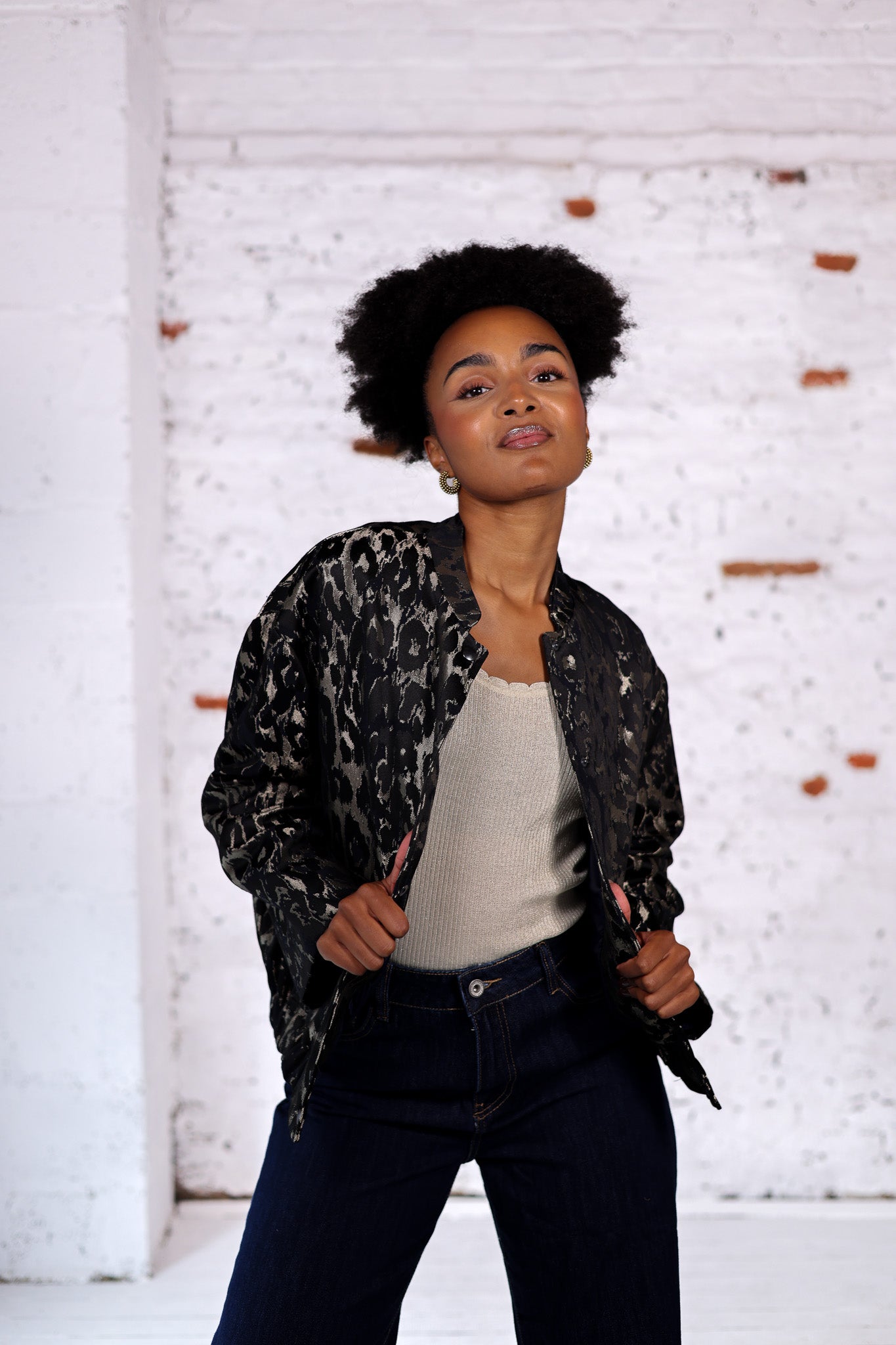 Un bombers audacieux au motif léopard, parfait pour celles qui veulent affirmer leur style avec une pièce forte et tendance.