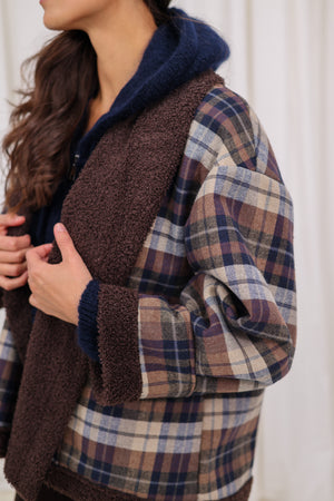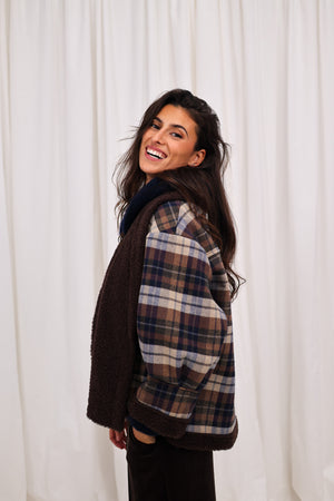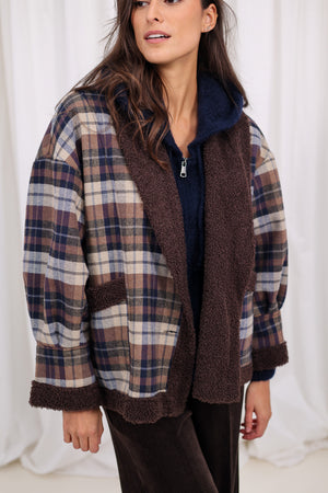 La veste à carreaux finition bouclette, dans une couleur bleu profonde et ultra tendance.