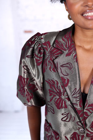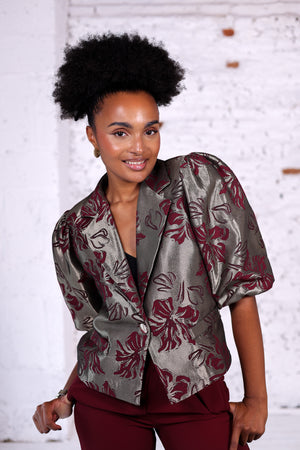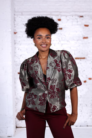 Optez pour l’élégance avec cette veste aux motifs floraux bordeaux sur fond gris métallisé. Son tissu satiné légèrement structuré lui apporte une touche raffinée et sophistiquée, idéale pour donner du caractère à vos tenues. Sa coupe droite avec des manches bouffantes modernise le look et offre un volume élégant, parfait pour une allure chic et tendance.