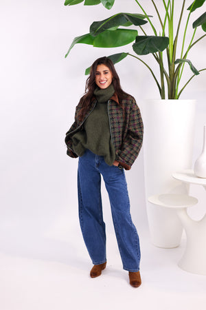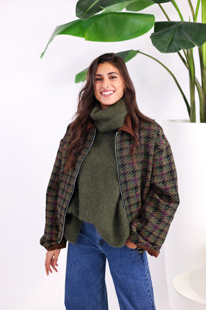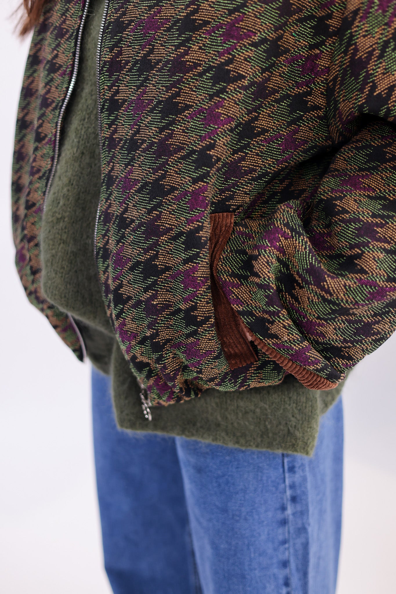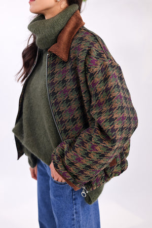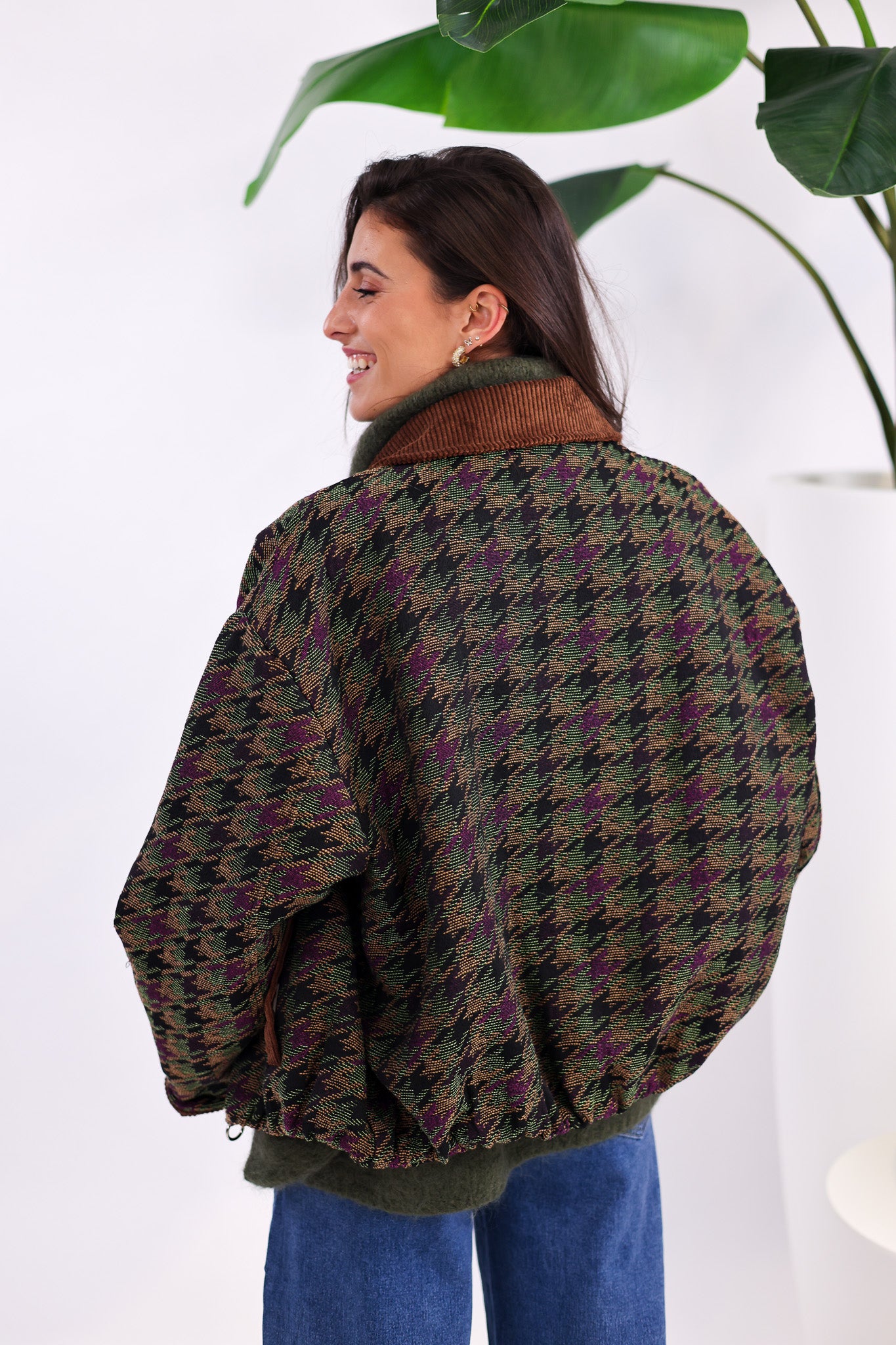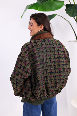 Cette veste bombers est la pièce forte parfaite pour donner du caractère à vos looks d’automne-hiver. Son motif pied-de-poule revisité, mêlant des touches de vert, bordeaux, camel et noir, apporte une allure chic et graphique, idéale pour sublimer une tenue basique ou compléter un look plus travaillé.