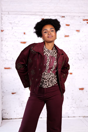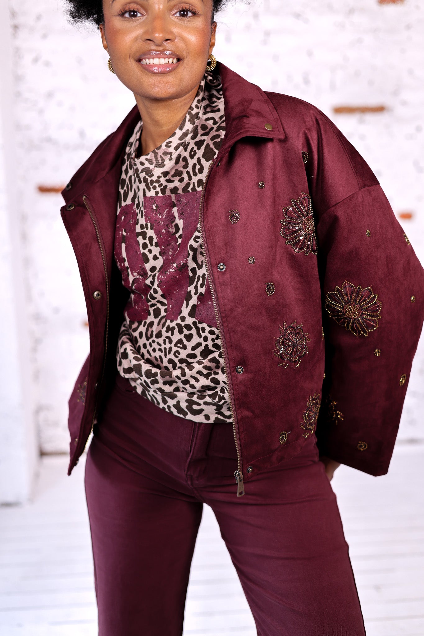 La veste parfaite pour affirmer ton style. Avec sa couleur bordeaux intense et ses broderies raffinées, elle allie caractère et élégance. Une pièce forte qui attire tous les regards et sublime instantanément une tenue.