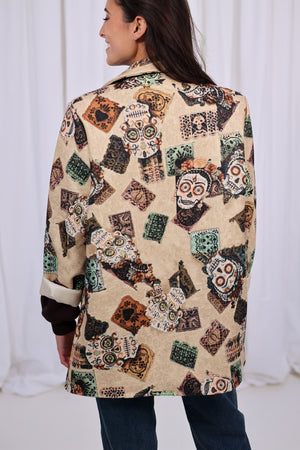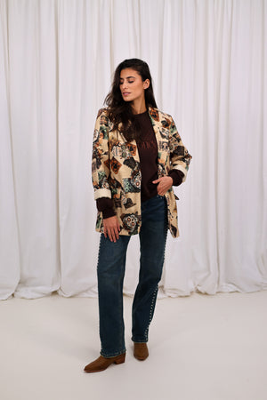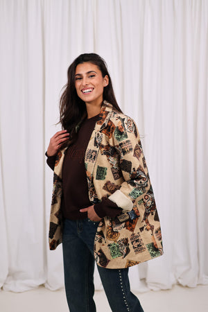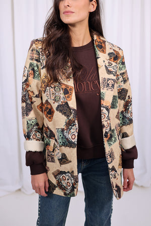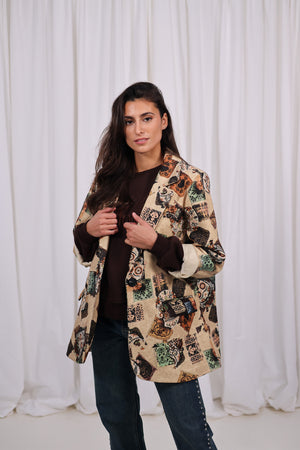 Avec son imprimé original sur fond flanelle, il revisite les codes du blazer classique pour un rendu à la fois moderne et intemporel.