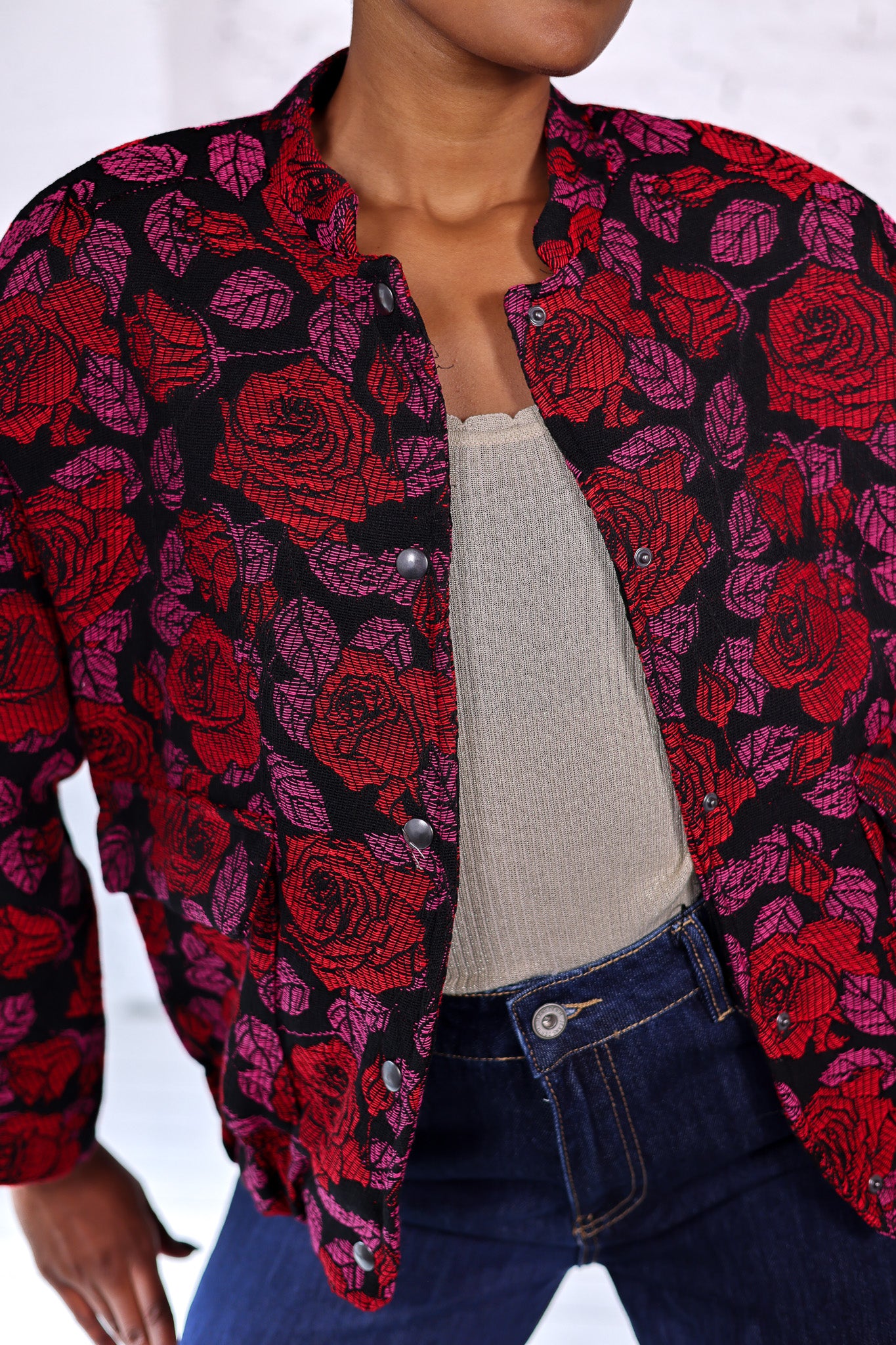 Un bombers féminin et audacieux, habillé d’un motif de roses rouges et fuschia foncé sur fond noir. Une pièce forte qui allie romantisme et modernité.