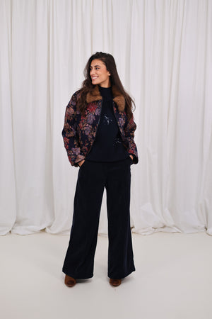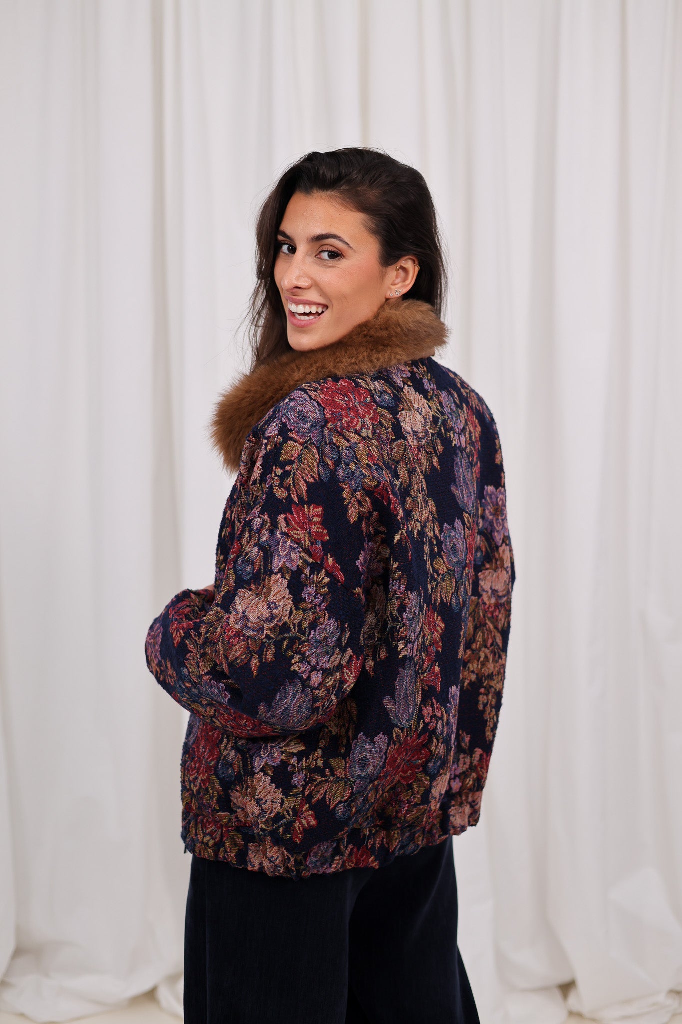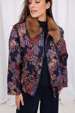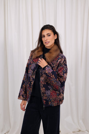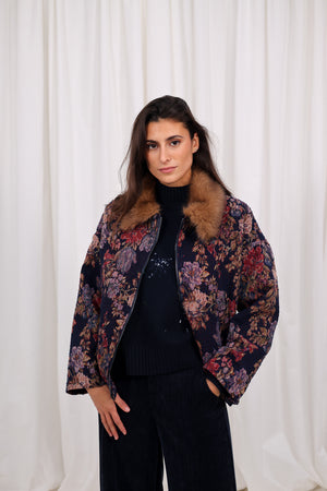 Cette veste à motif floral sur fond bleu nuit associe le charme vintage à une touche ultra-glam grâce à son col en fausse fourrure douce (non amovible).