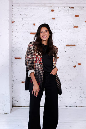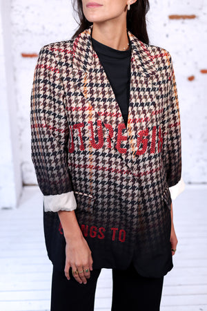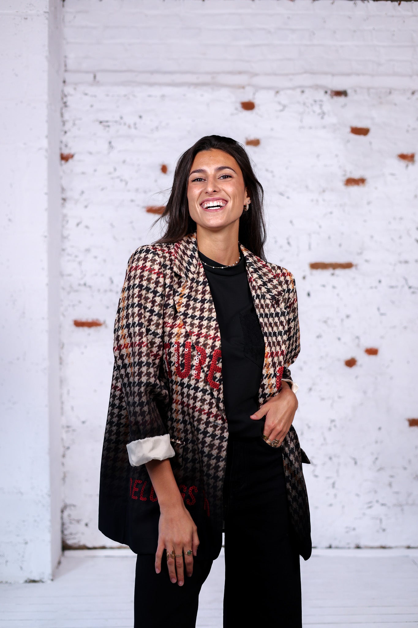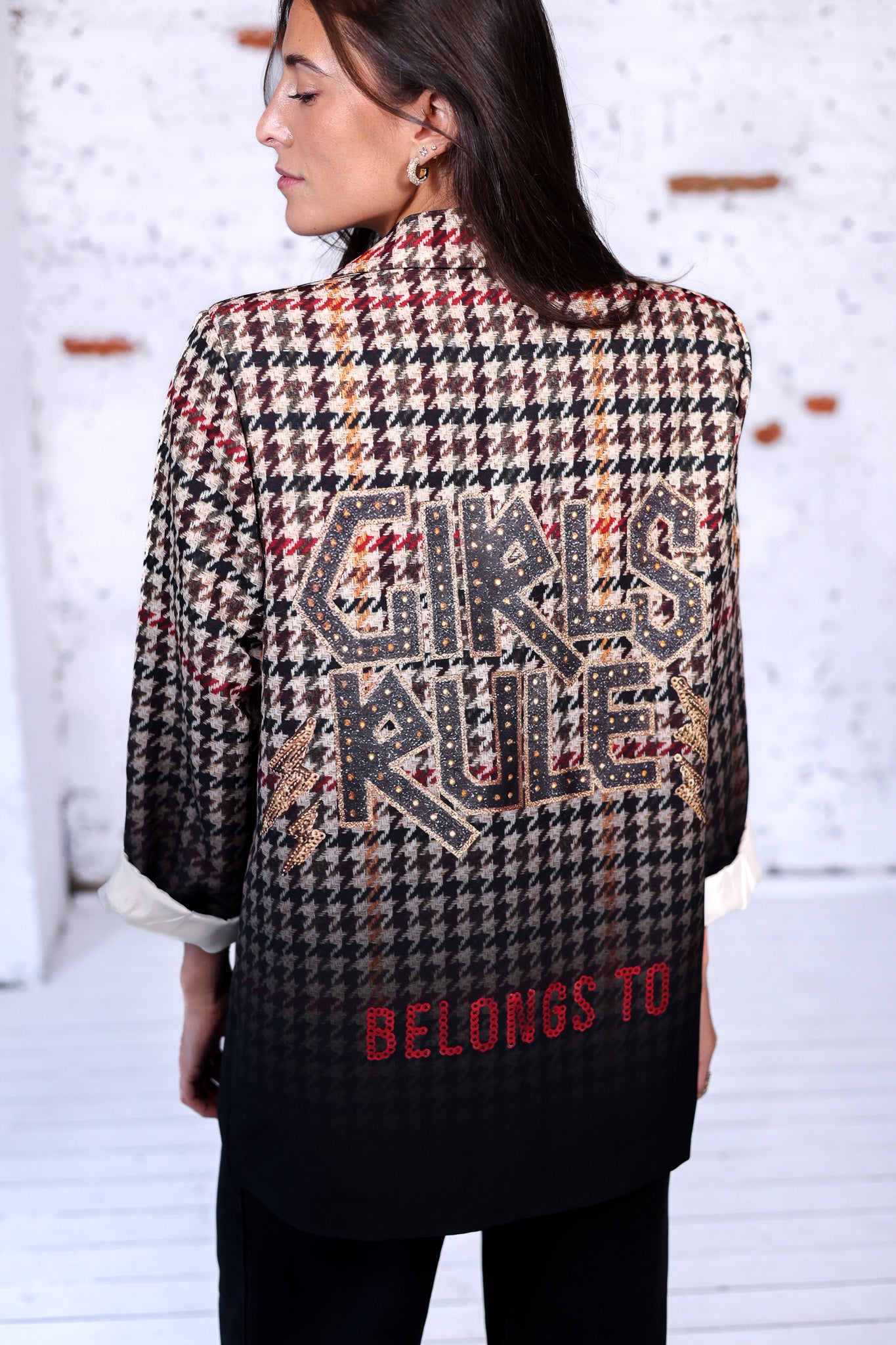 Une veste au style affirmé qui mixe l’intemporel motif pied-de-poule avec une touche rock & féminine. Au dos, l’inscription “Girls Rule” apporte un twist audacieux qui fait toute la différence. Idéale pour affirmer son style au quotidien, en journée comme en soirée.