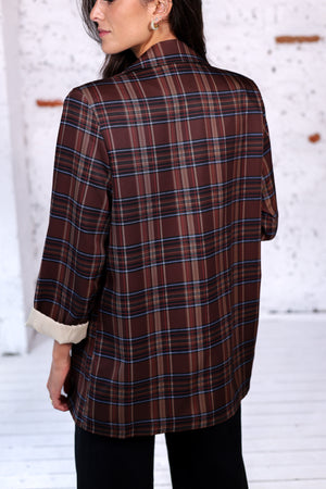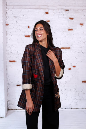 Un blazer à l'esprit italien chic et décontracté. Ses carreaux imprimés brun et bleu se marie avec des broderies originales « Dolce Vita », un cœur rouge et un patch denim qui lui donnent caractère et modernité. La veste idéale pour celles qui veulent allier confort et style affirmé.