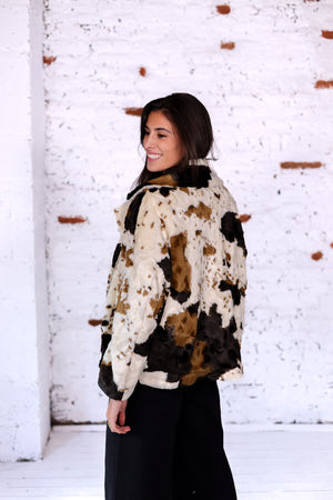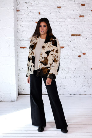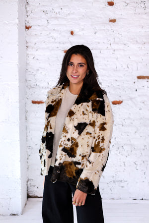 Chaleur, originalité et style affirmé ! Cette veste en fausse fourrure au motif tacheté mélange les tons beige, marron et noir pour un look unique et audacieux. À la fois douce et tendance, elle s’impose comme la pièce forte de votre garde-robe hivernale.