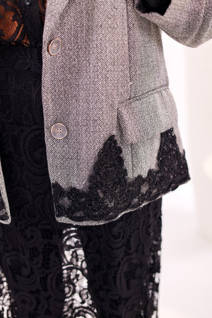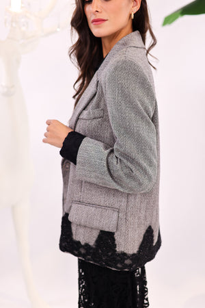 • Veste blazer en tissu texturé gris, au tombé fluide mais structuré.