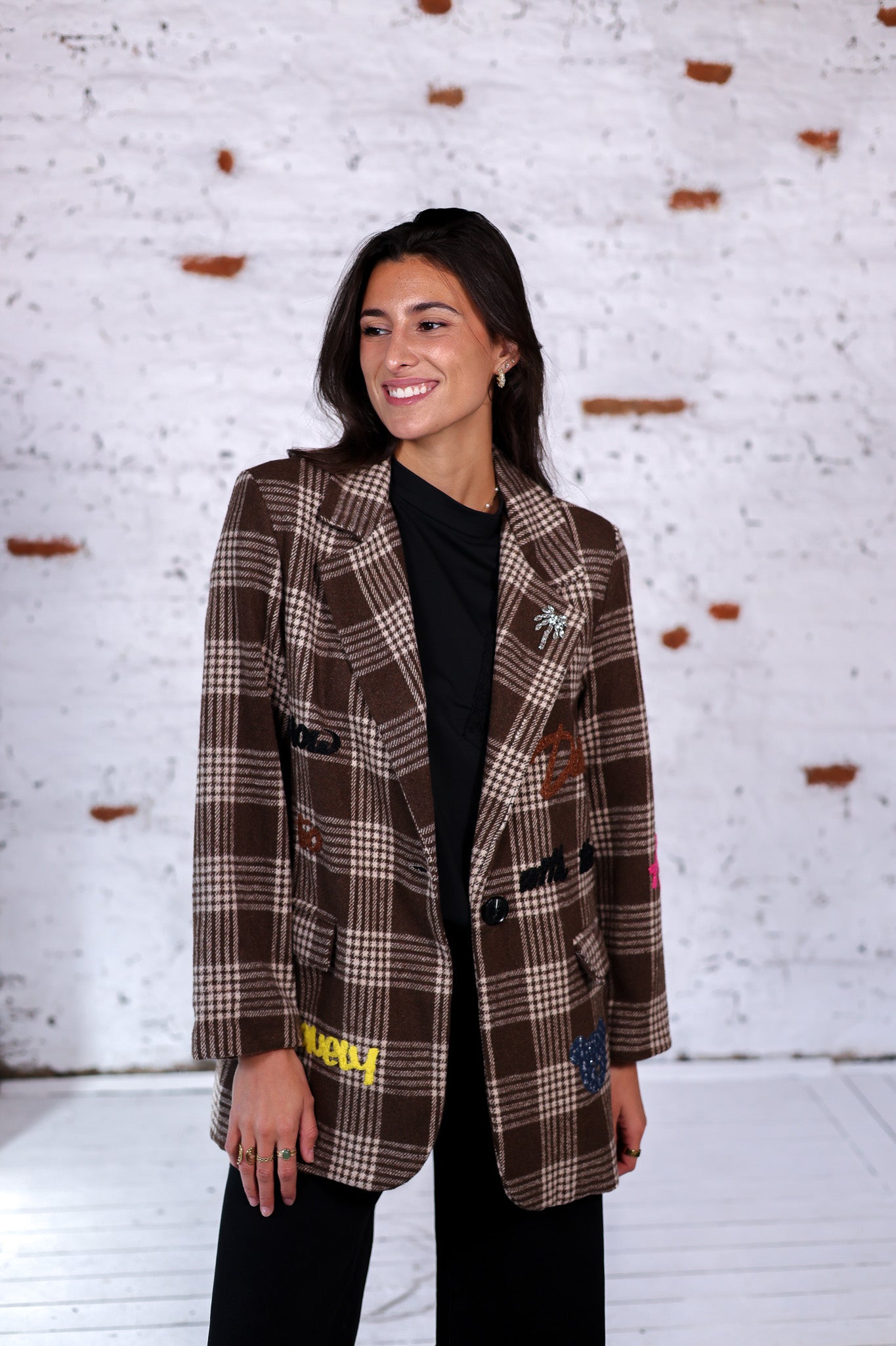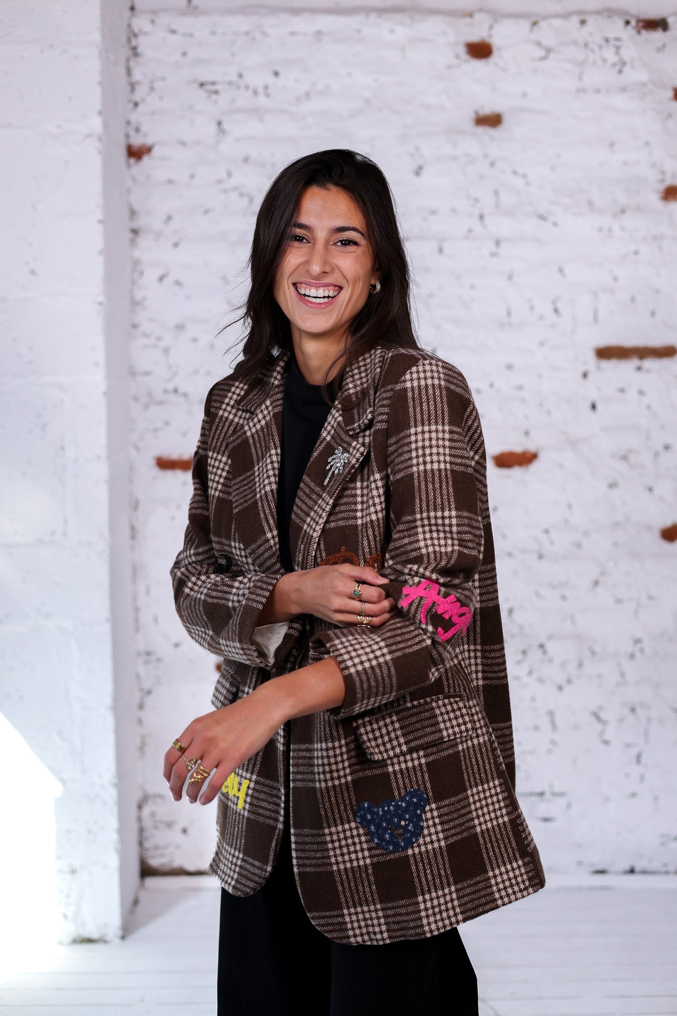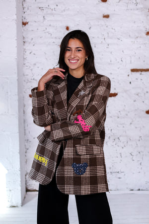 Veste oversize à carreaux bruns, sublimée par des broderies colorées et des patchs fun. Une pièce forte qui revisite le classique blazer à carreaux avec une touche arty et décontractée.