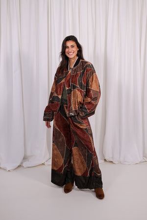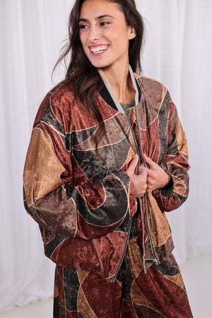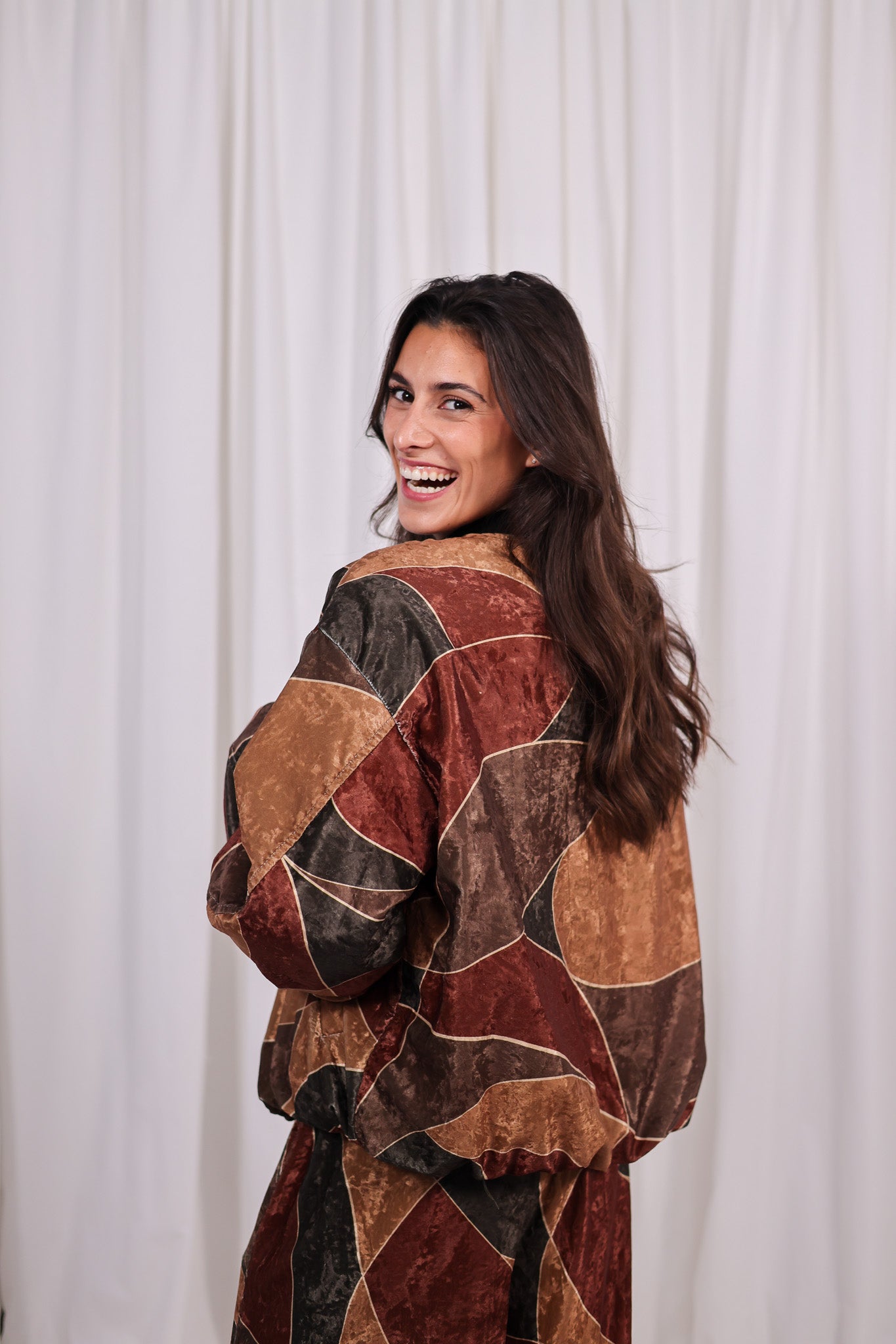 Sa coupe oversize et son velours ultra doux apportent un confort absolu, tandis que son imprimé géométrique aux tons cuivrés, rouille et camel insuffle une touche automnale tendance.