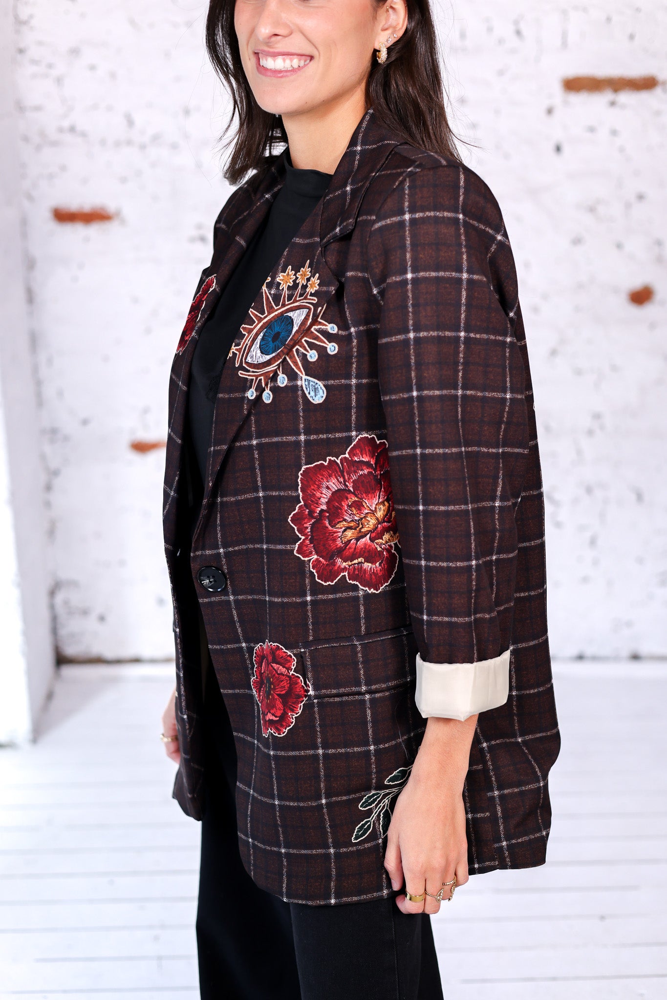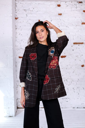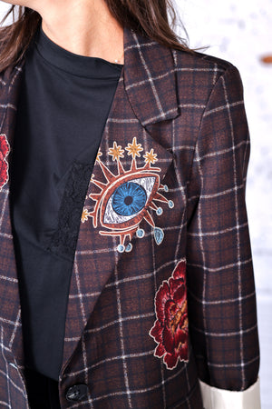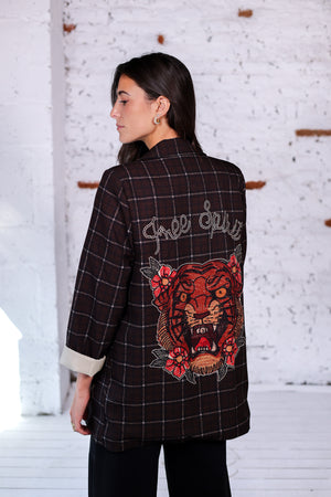 Un blazer au style affirmé qui mélange élégance et puissance. Sur un fond à carreaux brun, des broderies florales et un œil mystique à l’avant apportent une touche originale, tandis qu’un majestueux tigre brodé au dos accompagné de l’inscription “Free Spirit” impose un look audacieux et plein de caractère.