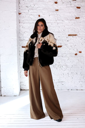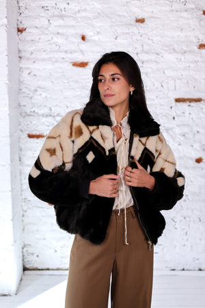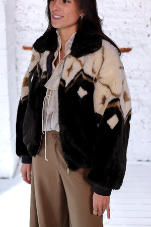 Chic et audacieuse, cette veste en fausse fourrure séduit par son imprimé graphique aux tons noirs, beiges et caramel. Douce et enveloppante, elle allie confort et style pour traverser la saison froide avec élégance. Sa coupe moderne et son col large apportent une touche sophistiquée, tandis que son motif géométrique assure un look affirmé et unique.