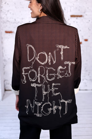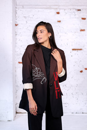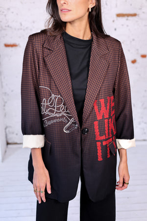 Une veste qui ne laisse pas indifférent. Avec son imprimé carreaux brun élégant et ses inscriptions brodées originales à l’avant et au dos, elle apporte une touche mode audacieuse à vos tenues. Un mélange parfait entre chic et esprit rock.