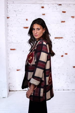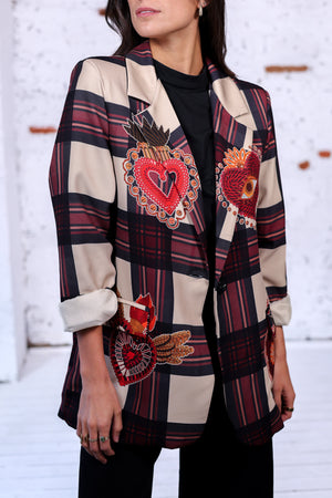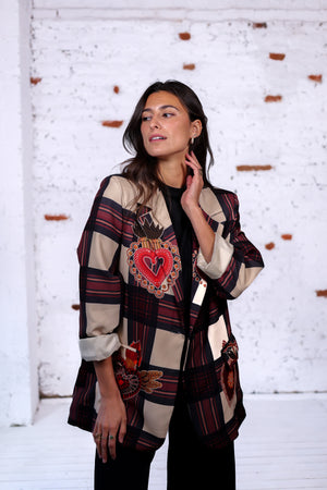 Un blazer original et audacieux qui associe l’élégance du carreau classique à des broderies colorées en forme de cœurs sacrés. Une pièce unique qui attire le regard et affirme votre style, que ce soit avec un jean casual ou une tenue plus chic.