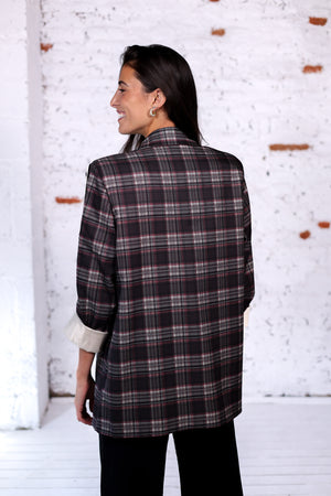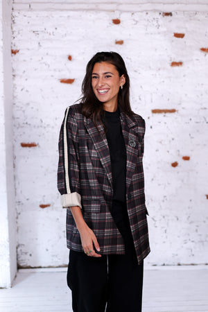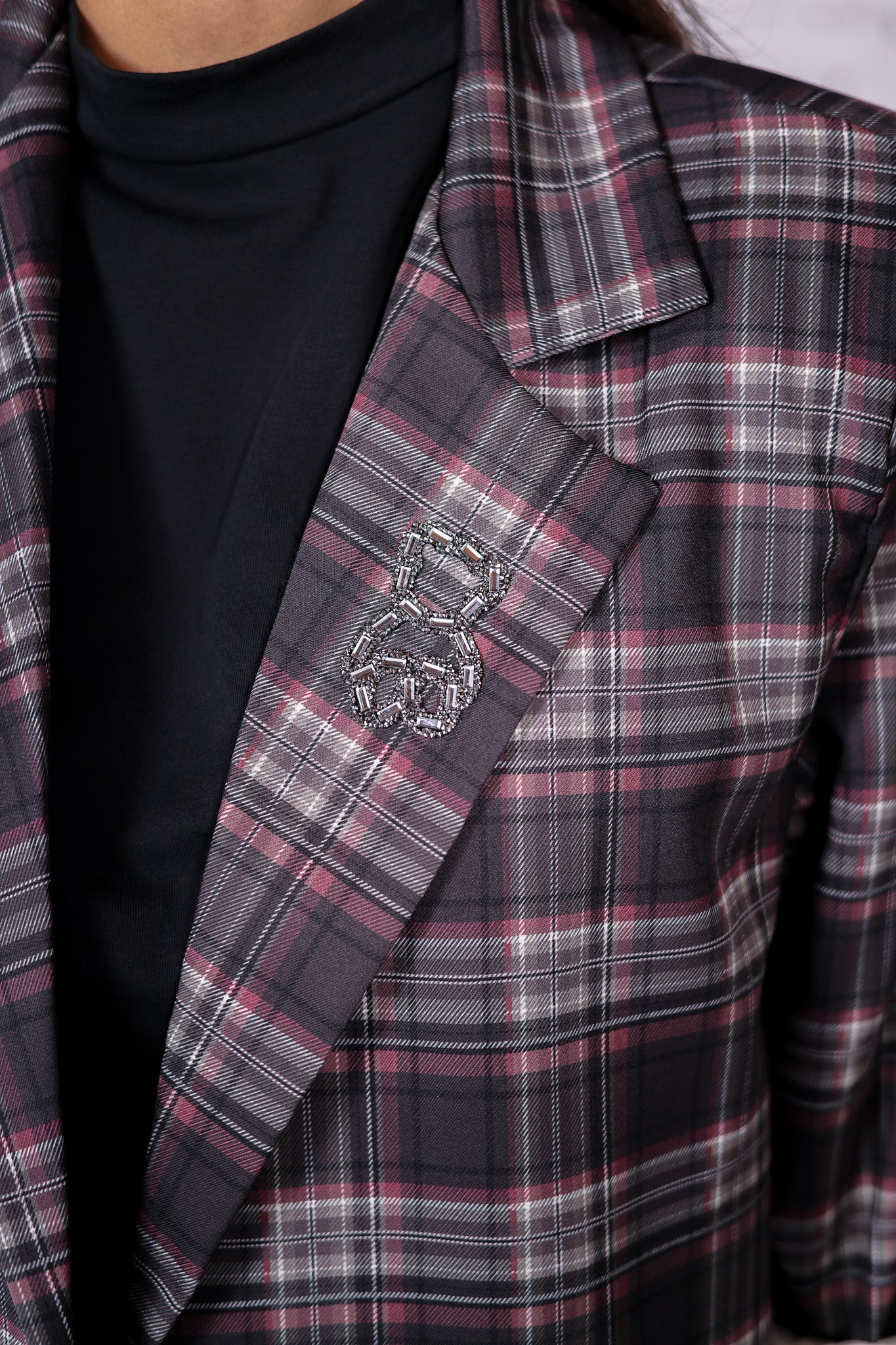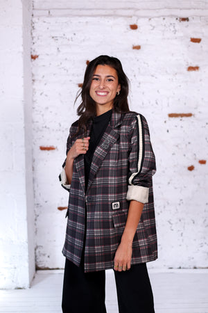 Un blazer aux carreaux raffinés dans des tons bordeaux, noir et gris, sublimé par un détail brodé scintillant sur le revers. Sa coupe lui donne une allure moderne et décontractée, tandis que la bande contrastée sur l’épaule ajoute une touche sport-chic irrésistible.