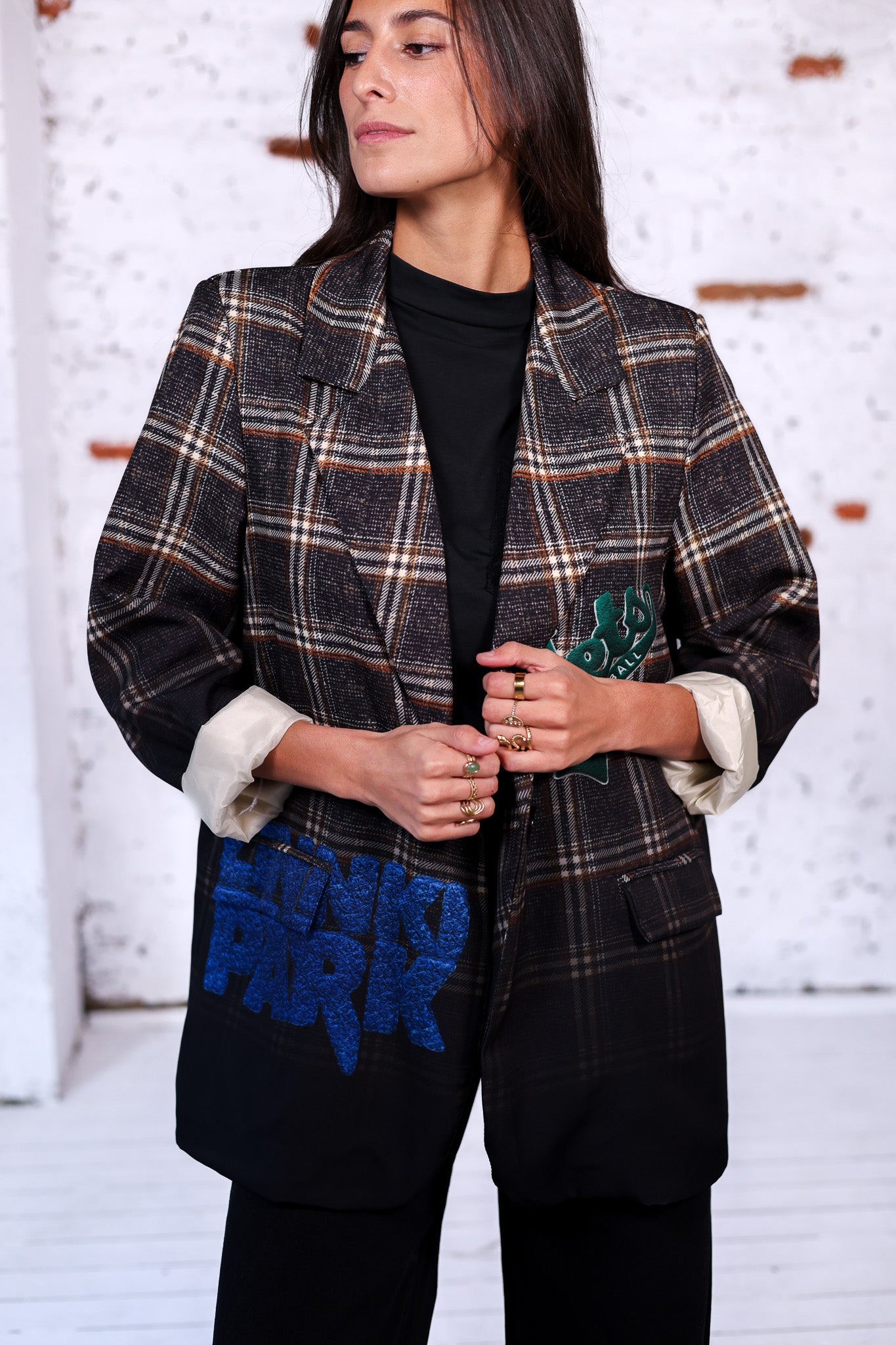 Un blazer au style unique qui revisite l’imprimé carreaux avec des imprimés modernes et décalées. À l’avant, l’inscription Jets Football donne un twist sportswear, tandis qu’au dos, les inscriptions “Amour” et “I’m not here” apportent une touche arty et pleine de caractère. Une pièce forte qui ne passe pas inaperçue !