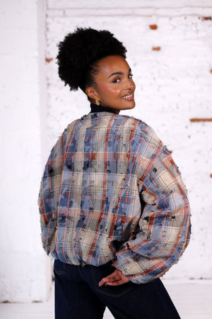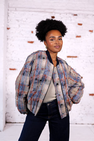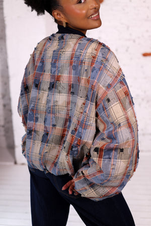 Un bombers unique et tendance, revisité dans une version à carreaux texturés. Sa coupe ample et son style décontracté en font une pièce forte pour vos looks de saison.