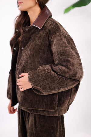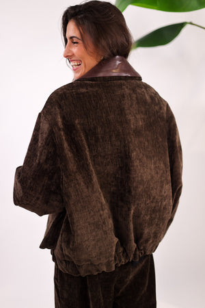 Le détail qui fait toute la différence : son col en simili cuir qui ajoute une touche élégante et sophistiquée, contrastant délicatement avec la texture du velours.