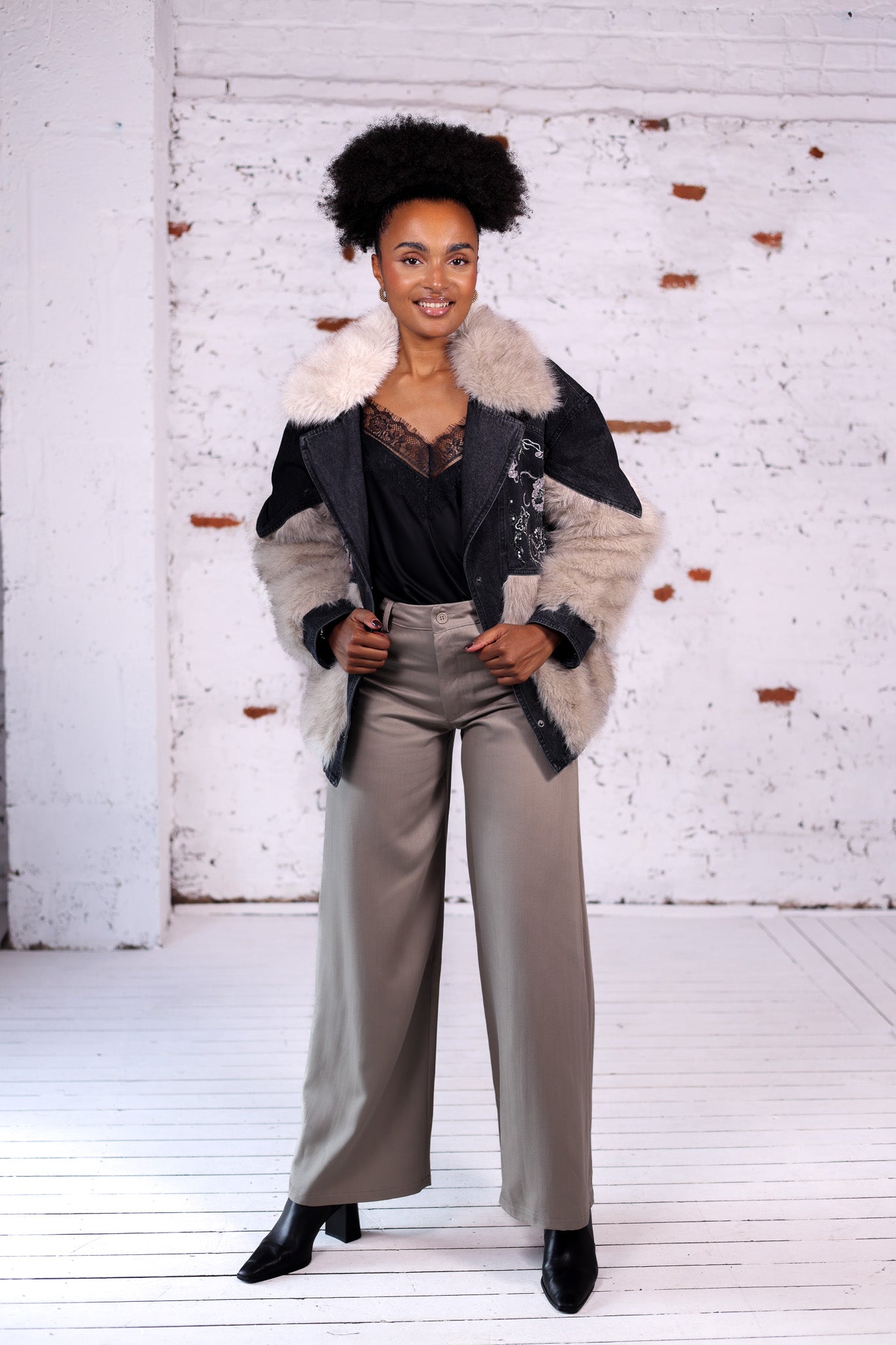 Version noire de la veste, pour un style encore plus chic et sophistiqué. La rencontre du denim foncé et de la fausse fourrure beige crée un contraste élégant et moderne.