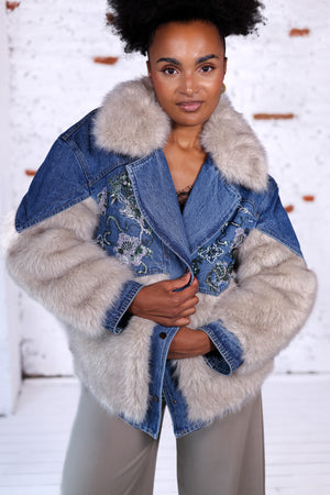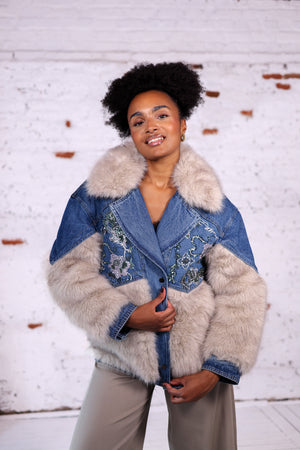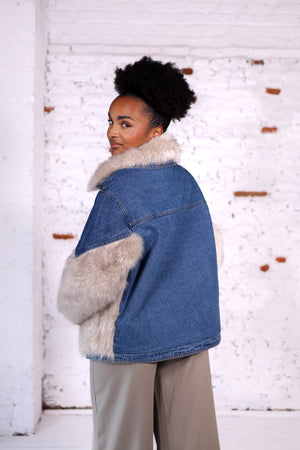Veste tendance mêlant le style casual du denim et l’élégance d’une fausse fourrure douce et volumineuse. Une pièce originale qui allie confort et caractère pour un look affirmé.