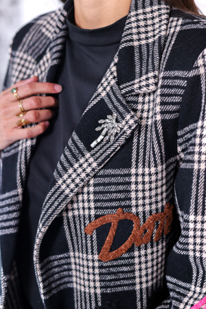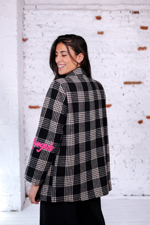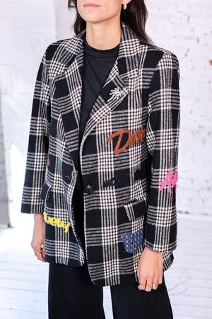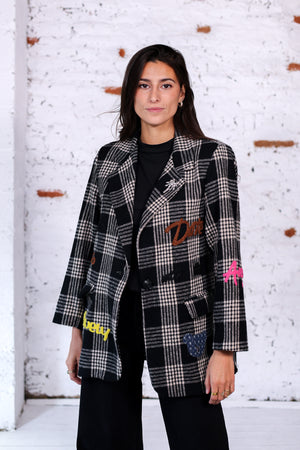 Veste oversize à carreaux noirs et blancs, twistée de patchs et broderies aux couleurs vives. Entre pièce urbaine et esprit arty, elle impose un style affirmé et moderne.