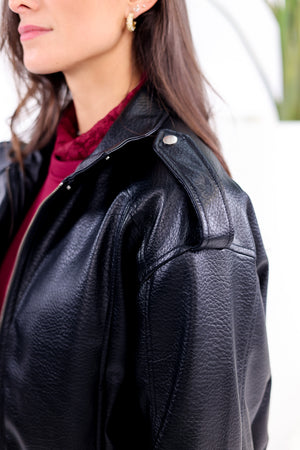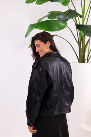 Craquez pour cette veste en simili-cuir noir au style chic et tendance. Avec sa coupe légèrement oversize et sa matière grainée qui imite parfaitement le cuir, elle apporte une allure moderne tout en restant confortable et facile à associer. Un indispensable du dressing pour finaliser toutes vos tenues avec une touche rock et élégante.